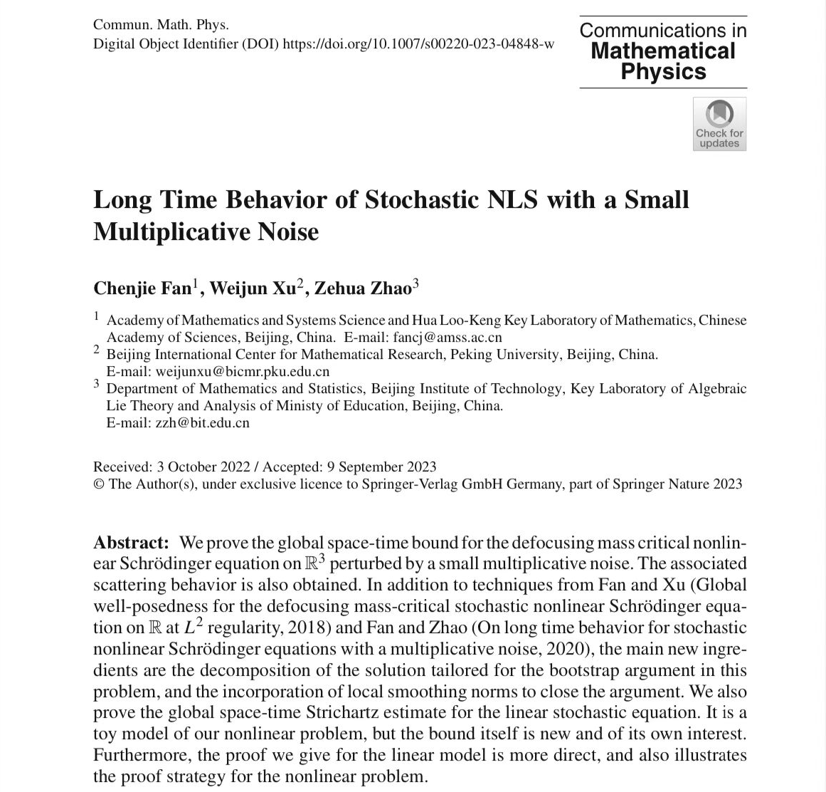 日前,北京成品人和一品二品的区别数学与统计学院教师赵泽华(通讯作者)与中科院数学与系统科学研究院教师范晨捷、北京数学中心教师许惟钧合作在期刊《Communications in Mathematical Physics》上合作发表题为《Long Time Behavior of Stochastic NLS with a Small Multiplicative Noise》的研究论文。该论文研究方向为随机偏微分方程,得到了带小可乘噪音的随机型薛定谔方程的长时间行为结果,使得此结果的成立不需要此前德国著名数学家Röckner教授团队关于噪音的衰减假设(Herr-Röckner-Zhang [Comm. Math. Phys., (2019) 368, 843-884])。